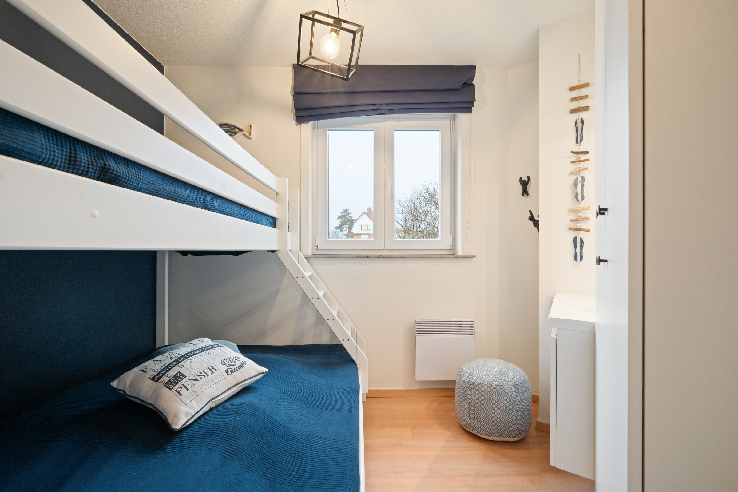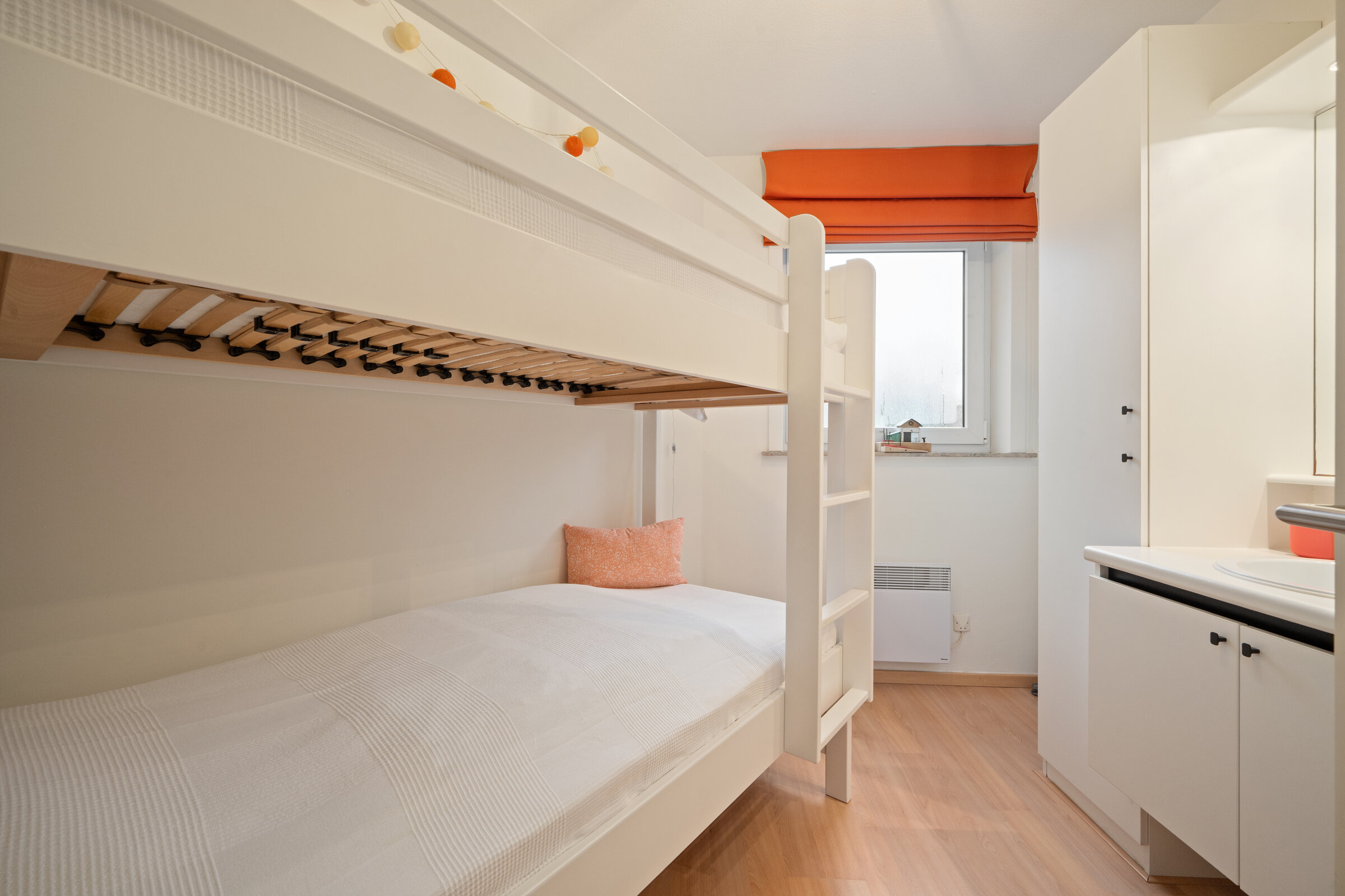 - Slaapkamer 2 : Tegelvloer, Kledingkast, Stapelbed drie personen, Enkele lavabo, 2-persoons donsdekens, Elektrische verwarming