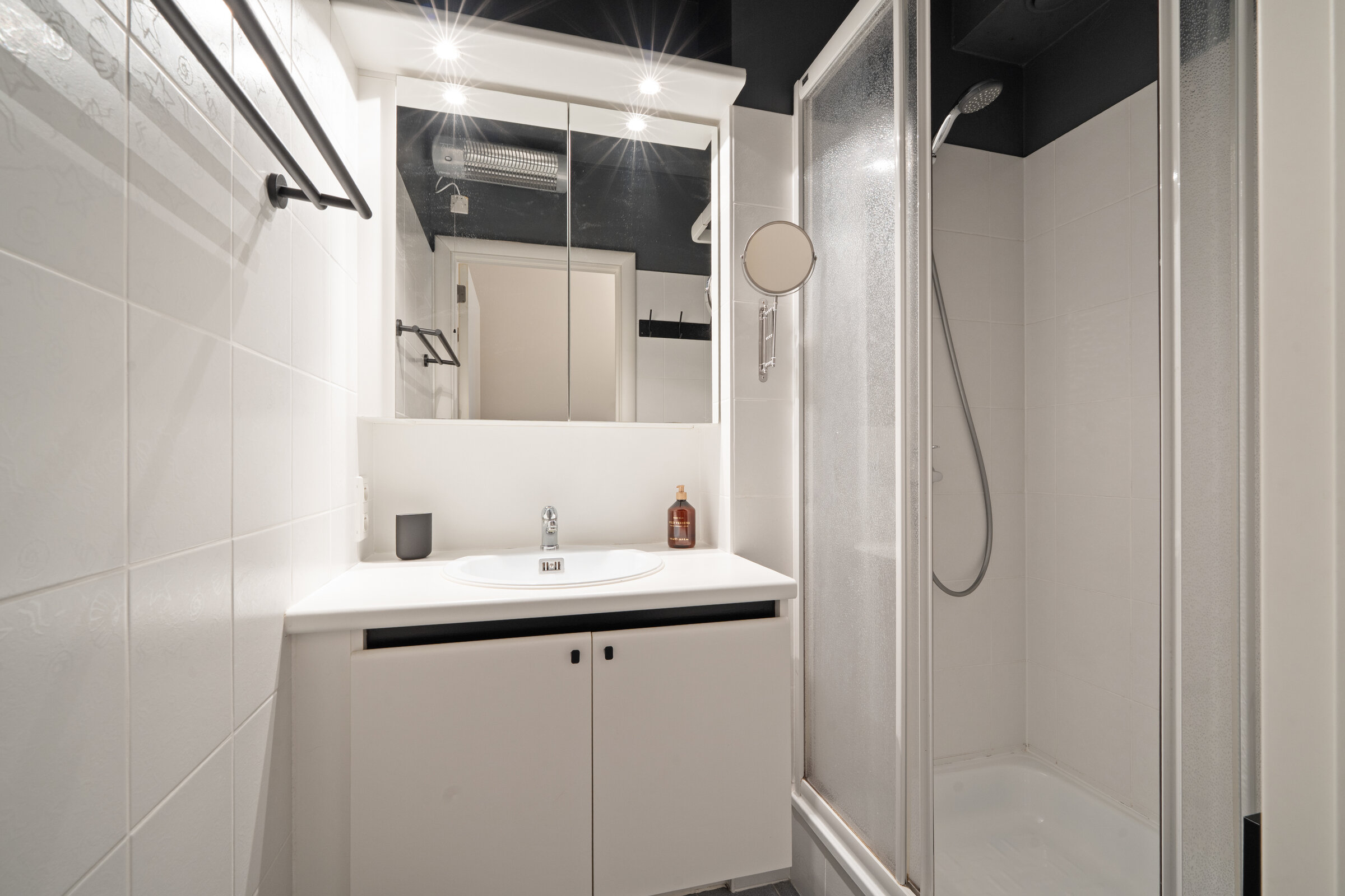 - Badkamer : Douche, Enkele lavabo, Bijzetradiator
