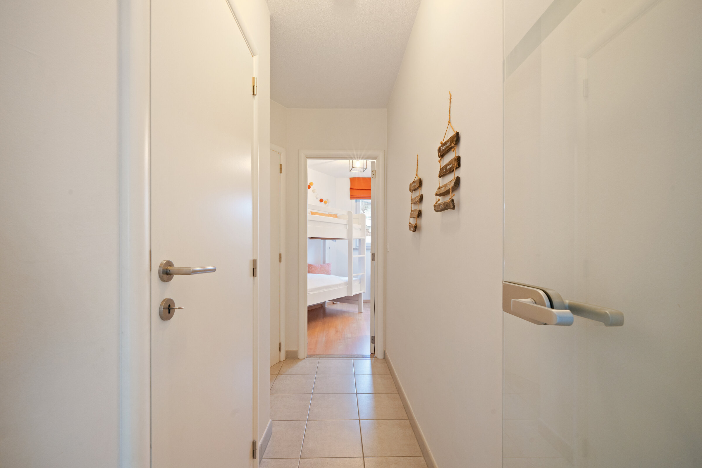 - Slaapkamer 3 : Tegelvloer, Kledingkast, Enkele lavabo, Donsdekens, Stapelbed twee personen