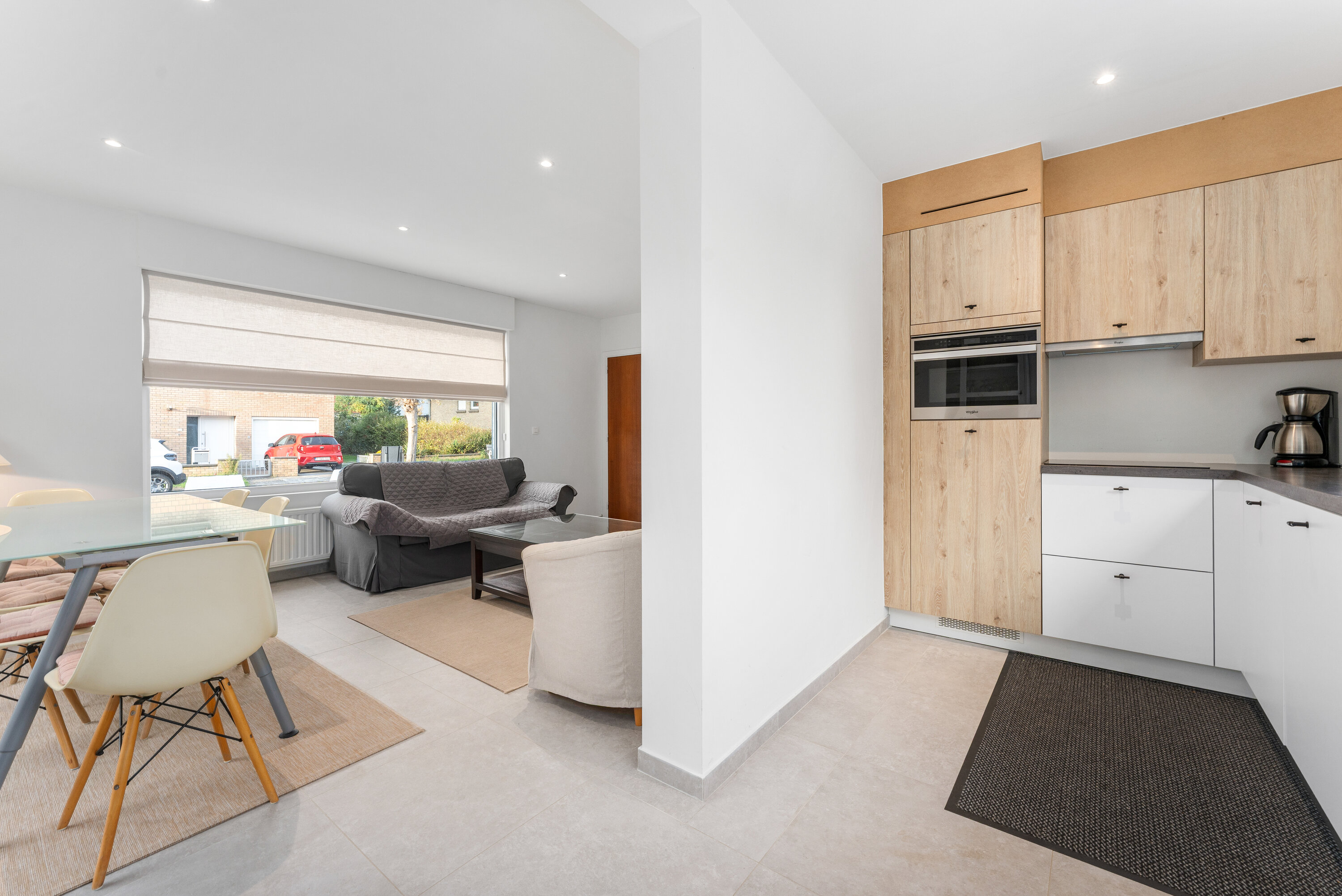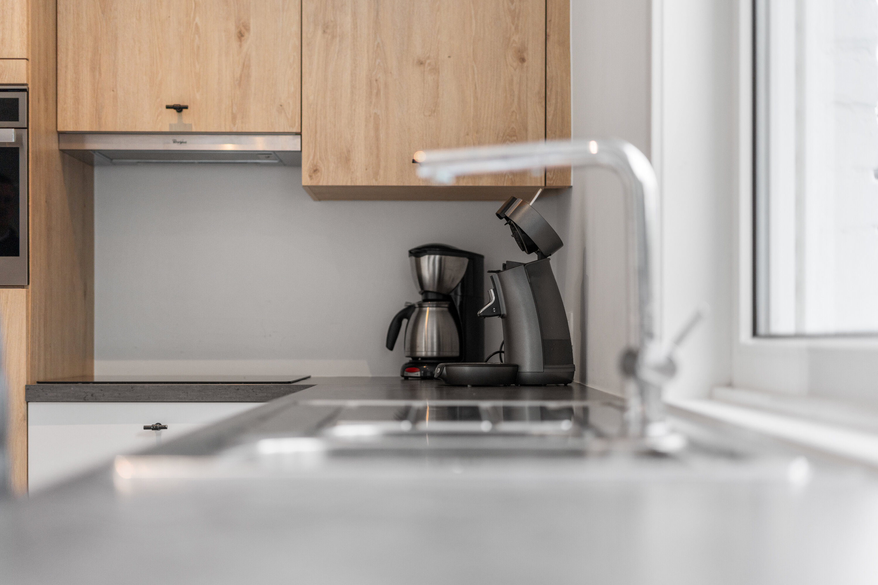 - Keuken : Microgolfoven met grillfunctie, Afzuigkap, Vaatwasmachine, Kookplaat inductie, Koelkast zonder diepvriesvak, Waterkoker, Broodrooster, Mixer, Koffiezetapparaat met pads, Koffiezetapparaat met filter
